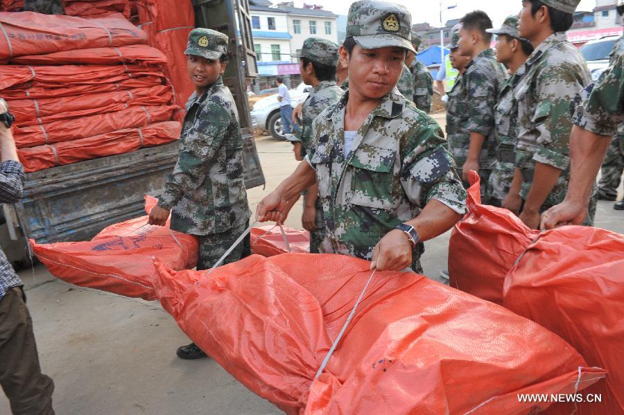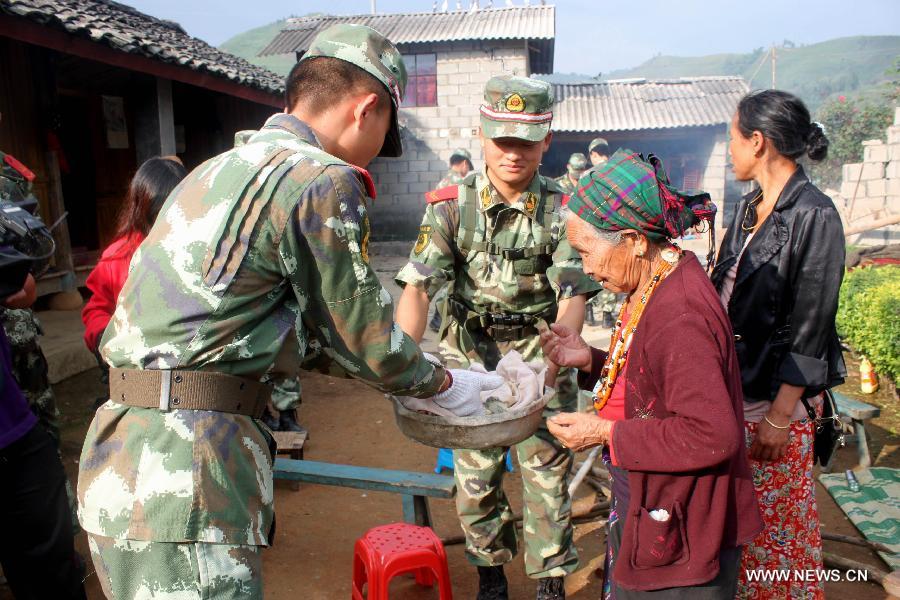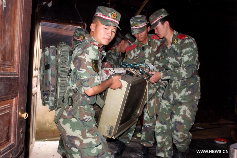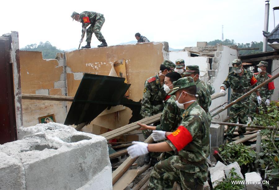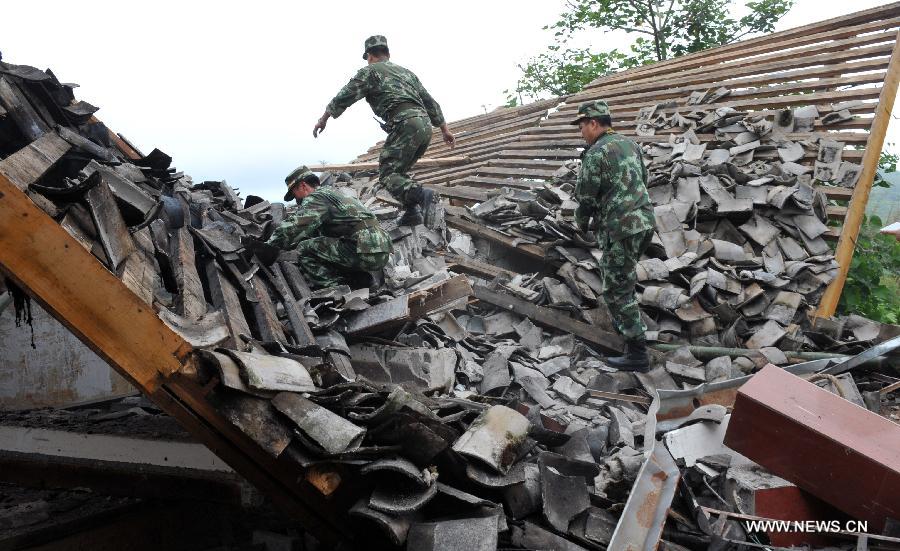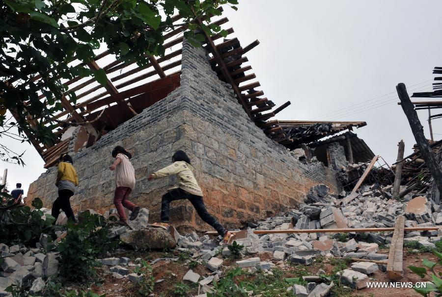 Girls walk past a collapsed house after an earthquake at Wupai Village in Kachang Town of Yingjiang County in Dehong Dai and Jingpo Autonomous Prefecture, southwest China's Yunnan Province, May 24, 2014. A 5.6-magnitude earthquake jolted Yingjiang County at 4:49 a.m. Saturday (Beijing Time), according to the China Earthquake Networks Center. Thirteen people have been injured as of 2:00 p.m. Investigations and disaster relief near the epicenter have been carried out. (Xinhua/Chen Haining)
