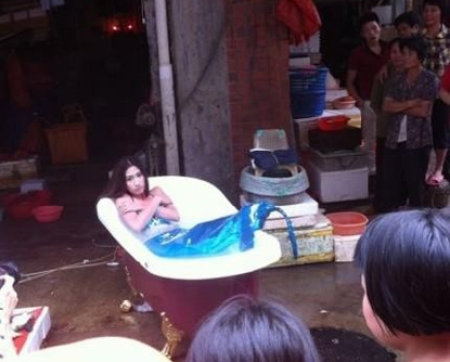Several days later the group returned with the girl and a bathtub. Chen says that the girl was wearing a mermaid-like costume and the group spent over half an hour shooting, which drew much attention from the public.