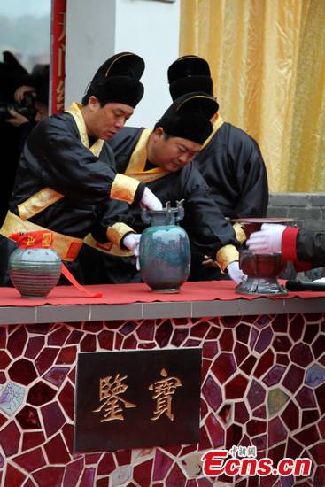 The Craftsmen reappear a complete process of taking ceramics productions out of a kiln in the Song Dynasty (AD 960- 1279) during the opening ceremony of the Jun Porcelain Culture Festival at Shenhou Township, known as the "living ancient town", in Yuzhou, central China's Henan Province, November 6, 2011. [CNS Photo/Hu Ying]