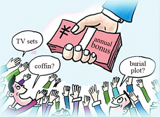 (Ecns.cn)--Some unusual annual bonuses have sparked heated discussion online, with coffins and burial grounds topping the list of the weirdest, reported the Yangtze Evening Post on December 31.