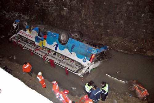 A bus from the city of Yiwu in east China's Zhejiang province, bound for the city of Luzhou in southwestern Sichuan province, fell off the bridge and plunged into a 10-meter-deep crevice at about 6:40 pm while traveling on an icy section of the Lanzhou-Haikou expressway.