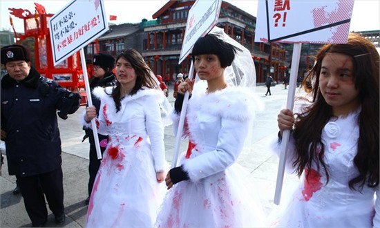 The "brides" started walking at 11:30 am at the south end of Qianmen. The girls, faces made up as if they were victims of abuse, lifted placards with slogans that included "Love is not an excuse for domestic violence" and "Will you keep silent when violence is around?"