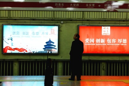 In November last year, the words patriotism, spirit, inclusion and virtue were nominated by the public as the four best words that sum up Beijing's spirit. People were given the chance to select from clusters of words provided by a panel of more than 30 experts by voting on popular news websites including Sina and Sohu. Nearly three million people voted in the survey and now the slogan, predominantly depicted on a plain red background, can been seen in a variety of public places, including bus stops, construction sites, street corners and inside subway stations.