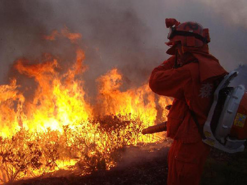 A firefighter tries to put out forest fire spread to Caopu Township in Anning, a county-level city on the outskirts of Kunming, capital of southwest China's Yunnan Province, March 19, 2012. [Photo: Xinhua/Xu Tao]