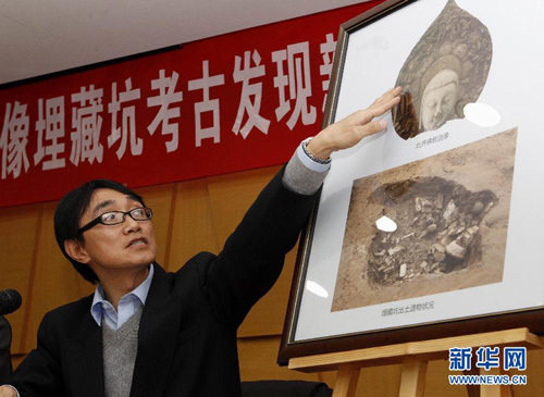 Pictures of ancient Buddha statues unearthed in Hebei Province are displayed at a press conference in Beijing held by the Chinese Academy of Social Sciences and Hebei Provincial Institute of Cultural Heritage on March 19.
