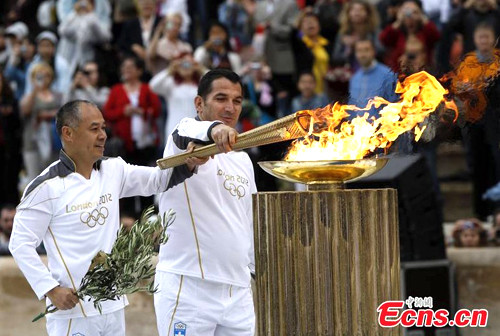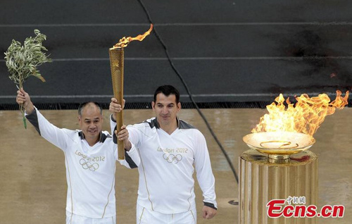 Former Chinese gymnast and Olympic medalist Li Ning and Greek veteran weightlifter Pyrros Dimas were the final torchbearers in the Greek leg of the relay whose job it was to ignite the cauldron at the Panathinaikon Stadium in Athens as on Thursday.
