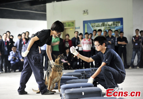Police hold a demonstration with the canine unit of the Chongqing Public Security Bureau, May 24, 2012. More than 30 Chongqing residents were invited to the open exhibition of seven police dogs. [Photo: CNS]