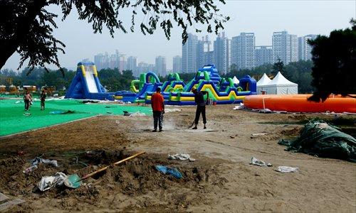 The Global Times found on Sunday that nearly half of the park is now a construction site, which has been fenced off. On the grass nearby, there are many emergency shelter signs, which point to emergency water or electricity supplies.