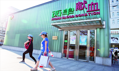 Pedestrians walk past Xidan Blood Donation Center Monday. Starting from Sunday, lesbians are allowed to donate blood in China. Photo: Li Hao/GT