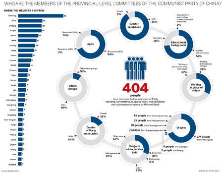 Members from the political center Beijing only occupied five seats. Those from economic powerhouse Guangdong province took seven seats, and Shanghai natives got four seats.