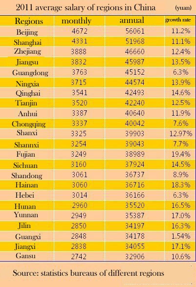 The average annual salary of urban non-private employees reached 42,452 yuan in 2011, 14.3 percent more than the average salary of 37,147 yuan in 2010. The actual growth rate is 8.5 percent if inflation is deducted, according to National Bureau of Statistics.