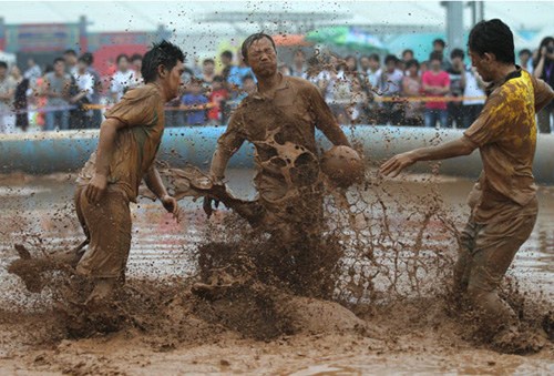 Players compete on Friday in the Chinese leg of the British Mud Soccer Cup in Beijing's Olympic Park. The event attracted 32 teams. [Photo: Wang Jing / China Daily]