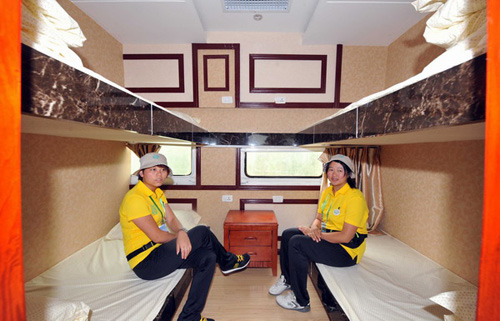 Two employees sit in a guest room of a train-turned hotel in Xifeng county, Southwest China's Guizhou province, on July 18, 2012. [Photo/Asianewsphoto]