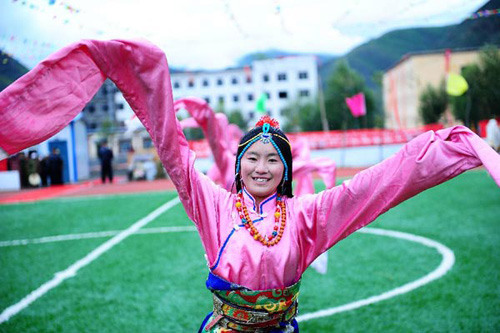 Teachers perform dance during the completion ceremony of Sino-Congolese friendship primary school in Chengduo County of Yushu Tibetan Autonomous Prefecture, northwest China's Qinghai Province, July 22, 2012. The Republic of Congo donated 16 million yuan (about 2.51 million U.S. dollars) to quake-hit Yushu for the construction of Sino-Congolese friendship primary school project in February 2011. The school, covering an area of 42,625 square meters, will be put into operation in this September. (Xinhua/Zhang Hongxiang)