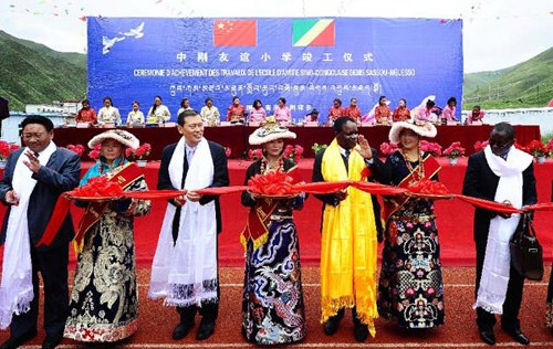 Foreign Minister of the Republic of Congo Basile Ikouebe (3rd R) attends the completion ceremony of Sino-Congolese friendship primary school in Chengduo County of Yushu Tibetan Autonomous Prefecture, northwest China's Qinghai Province, July 22, 2012. The Republic of Congo donated 16 million yuan (about 2.51 million U.S. dollars) to quake-hit Yushu for the construction of Sino-Congolese friendship primary school project in February 2011. The school, covering an area of 42,625 square meters, will be put into operation in this September. (Xinhua/Zhang Hongxiang)