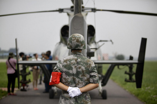 A soldier stands guard behind a Z-9WZ military helicopter designed and manufactured by China during a media visit at the military base of Chinese People's Liberation Army (PLA) Army Aviation 4th Helicopter Regiment, on the outskirts of Beijing, July 24, 2012, ahead of Army Day on August 1. [Photo/Agencies]