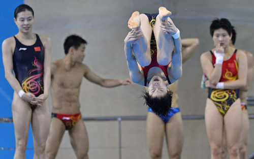 Chinese divers practice at the Aquatics Center in the Olympic Park in Stratford in east London July 24, 2012. [Photo/Agencies]