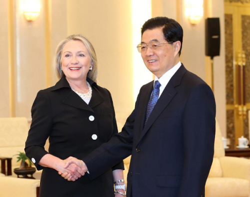 Chinese President Hu Jintao (R) meets with U.S. Secretary of State Hillary Clinton at the Great Hall of the People in Beijing, capital of China, Sept. 5, 2012. (Xinhua/Zhang Duo)