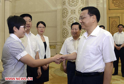 Chinese Vice Premier Li Keqiang (6th L) meets with a report team on deeds of Meng Xiangmin, a heroic environmental protection inspector in east China's Shandong Province, in Beijing, capital of China, Sept. 5, 2012.