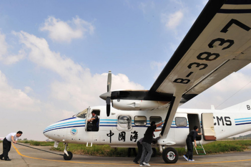 Workers with the China Maritime Surveillance East China Sea aviation fleet prepare for take-off at Zhoushan base in the eastern province of Zhejiang on Oct 17, 2012. The fleet has been regularly patrolling the islands in the East China Sea since 2010, when China's law on island protection went into effect. [Photo/Xinhua]