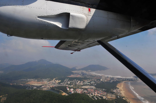 A China Maritime Surveillance aircraft patrols over islands in the eastern province of Zhejiang on Oct 17, 2012. [Photo/Xinhua]