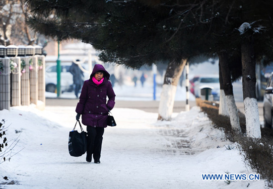 A local resident wears thick coat and hat to ward off coldness in Changchun, capital of northeast China's Jilin Province, Dec. 22, 2012. According to the provincial meteorological observatory, most parts of Jilin will suffer from a 13 to 16 degrees Celsiu