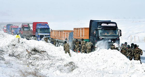Soldiers in the Xinjiang Uygur autonomous region clear the road for stranded vehicles on Sunday. A cold snap is causing traffic delays in parts of China. Zou Yi / For China Daily