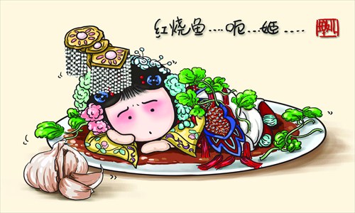 Most people got to know Shi (nicknamed Pangbuduner, which roughly translates to "chubby") and her A Bite of Peking Opera through a series of cartoons she posted on Sina Weibo recently. There are 19 pictures so far, each depicting a classical figure in Peking Opera drawn as a yummy dish based on the looks and colors of that character, explained Shi.