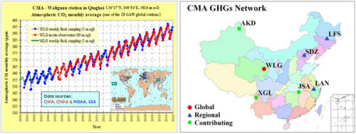 Since 1980s, China Meteorological Administration (CMA) has put in place seven atmospheric background stations-Waliguan in Qinghai (WLG), Shangdianzi in Beijing (SDZ), Lin'an in Zhejiang (LAN), Longfengshan in Heilongjiang (LFS), Shangri-La in Yunnan (XGL), Jinsha in Hubei (JSA) and Akedala in Xinjiang (AKD), which represent a number of typical climatic, ecological and economic zones in China. Greenhouse gases and related tracers have been observed by network stations in a standard and consistent routine in response to the Kyoto Protocol and the Montreal Protocols. In particular, the Waliguan Global Atmosphere Watch Baseline Observatory has engaged in flask air sampling analysis since 1990 and in-situ observation since 1994. The 20-year history in observation rewards the longest time series in atmospheric CO2 records in China. The flask air sampling analysis and the in-situ observations were launched in other background stations beginning from 2006.