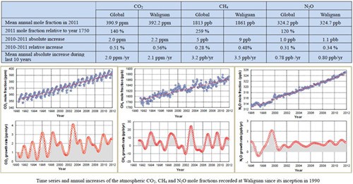 As analyzed from observational data at the seven China Meteorological Administration (CMA) background stations through 2011, averaged mole fractions in atmospheric CO2, CH4 and N2O also hit new highs in 2011, with the Waliguan station in Qinghai registering 392.2 ppm for CO2, 1861 ppb for CH4 and 324.7 ppb for N2O. As a record high since the observation was started in 1990, they are roughly equivalent to the averaged mole fractions in the northern mid-latitudes, but are slightly higher than the global averages in all these components (390.9 ppm, 1813 ppb and 324.2 ppb) over the same period. Global mole fractions in atmospheric CO2, CH4 and N2O increased by 2.0 ppm, 5 ppb and 1.0 ppb in absolute terms, from 2010 to 2011, while those at Waliguan by 2.2 ppm, 9 ppb and 1.1 ppb. Global annual averages in atmospheric CO2, CH4 and N2O over the past 10 years increased by 2.0 ppm, 3.2 ppb and 0.78 ppb in absolute terms, while those at Waliguan 2.1 ppm, 3.5 ppb and 0.80 ppb.