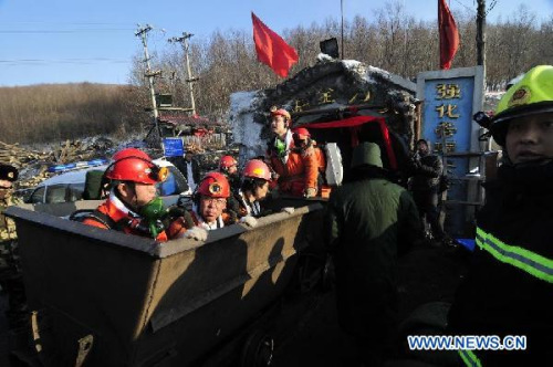 Rescuers are seen in a tramcar heading for the mine pit of Yongsheng colliery where a coal mine accident happened, in Dongning County, northeast China's Heilongjiang Province, Jan. 30, 2013. Three workers entered the Yongsheng colliery to conduct maintenance work but fainted due to poisonous gas in the colliery at around 10:30 a.m. on Jan. 29. A group of rescuers were then sent to the site, but some of them were also poisoned. The latest statistics showed that 12 workers died in the accident and eight others were injured. The rescue work is still underway. (Xinhua)