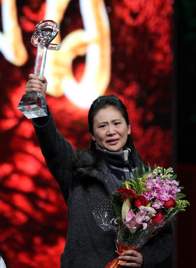 Luo Yang, who led the research of the J-15 fighter jet, died of a heart attack on Nov 25, 2012, after observing the flight landing test on the Liaoning, China's first aircraft carrier. He was 51. His sister received the award for him. On Tuesday evening, China Central Television gave 10 awards to people or groups that made special contributions to society.[Photo by Deng Jia/Asianewsphoto]