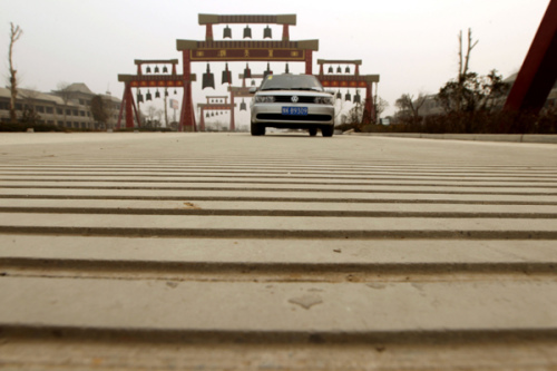 A tourist drives on a "musical road" that plays China's national anthem when motorists reach 40 kilometers per hour. The 300-meter long road at an ecological park in Changge city, Central China's Henan province is reportedly the country's only "musical road". A mixture of high technology, physics, musical knowledge and mechanics were used to create the groves in the road that when driven over creates a melody through the vibration of the wheels. When driving in the opposite direction, the road plays Jasmine which Dion and Song Zuying sang together at the CCTV Spring Festival Gala. A road in California that played the William Tell Overture to drivers has been paved over after complaints from local residents. The world's first musical road was created in Denmark in 1994 by two artists and quickly drew attention. [Niu Shupei/Asianewsphoto]