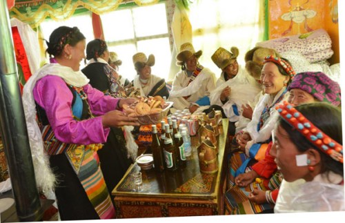 Tibetan villagers get together at a new house to celebrate the 54th Serfs Emancipation Day in Dinggye county, Xigaze prefecture, Southwest China's Tibet autonomous region, on March 27, 2013. The annual Serfs Emancipation Day is held on March 28 to commemorate the 1959 democratic reform in Tibet, which ended feudal serfdom and freed about one million Tibetan serfs.[Photo/Xinhua]