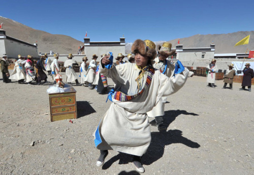 Tibetan villagers celebrate the 54th Serfs Emancipation Day with singing and dancing in Dinggye county, Xigaze prefecture, Southwest China's Tibet autonomous region, on March 27, 2013. The annual Serfs Emancipation Day is held on March 28 to commemorate the 1959 democratic reform in Tibet, which ended feudal serfdom and freed about one million Tibetan serfs.[Photo/Xinhua]