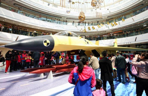 China's first full-sized model of the carrier-based fighter aircraft J-15, also known as the Flying Shark, is presented to visitors in Wanda Plaza, Qingdao, East China's Shandong province, on April 13, stirring excitement among military fans. [Photo by Xu Chongde/Asianewsphoto]