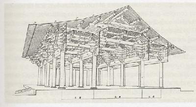 Located in the southwest of Wutai Mountains, the Nanchan Temple, built in the 3rd year (782) during the reign of Tang Emperor Jianzhong, is a very small hall, its plane close to a square shape. Because it is in great depth, the roof is of a single-eaved Xieshan type (two slopes on the upper part and four slopes on the lower). The slope of the hall is very gentle. Because the plane is close to a square, if the Chinese hipped roof (four slopes on the lower part) is adopted, the front ridge will appear to be too short, and the structure will be very complicated. If Xieshan is adopted, the proportions will be very suitable. Later, this became the method generally adopted for halls of a square or close to a square plane.