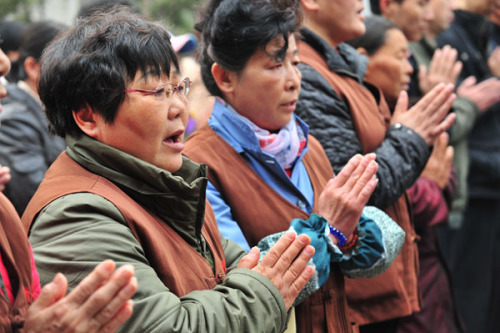 Buddhists pray for the quake zone at a prayer meeting in Guangji Temple in Beijing on April 23, 2013. The meeting was organized by the Buddhist Association of China and raised altogether 2.35 million yuan ($380,465) for Lushan county, Sichuan province. A 7-magnitude quake hit the southwestern county Saturday morning, claiming 193 lives and injuring 12,211 so far. [Photo by Li Zhou/Asianewsphoto]