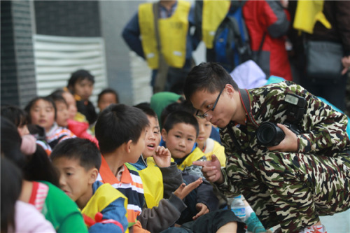 A volunteer plays games with children in quake-hit Lushan county, Southwest China's Sichuan province, April 23, 2013. [Photo by Cui Meng/Asianewsphoto]