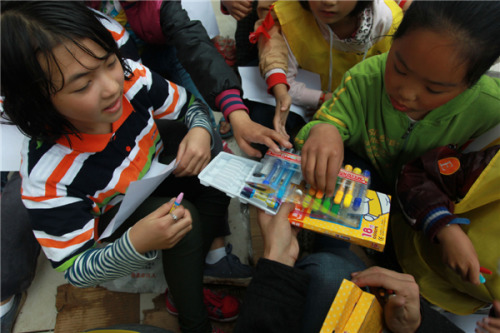 Children in quake-hit Lushan county, Southwest China's Sichuan province, get help in coping with the disaster through drawing, April 23, 2013. [Photo by Cui Meng/Asianewsphoto]