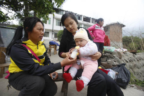 A woman feeds milk to a baby in Wuxing village, Lushan county, Sichuan province, April 22, 2013. [Photo by Chen Zhuo/Asianewsphoto]