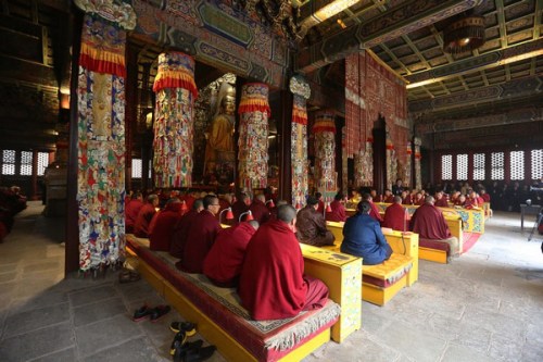 Monks pray for the victims of the earthquake, which struck Ya'an city in southwest China's Sichuan Province three days ago, in Yonghegong Lama Temple in Beijing, April 23, 2013. [Photo/China Tibet Online]