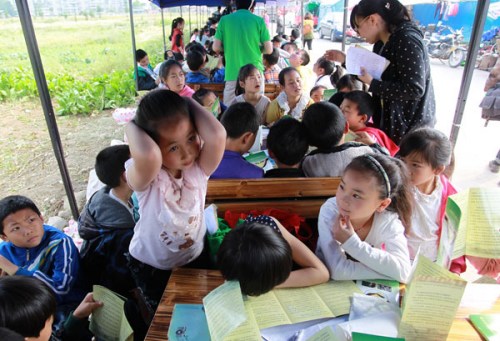 Students learn in a make-shift classroom in the quake-hit Lushan county, Sichuan province, April 26, 2013. Teachers also taught students how to cope with the post-quake stress. [Photo by Cui Meng/Asianewsphoto]