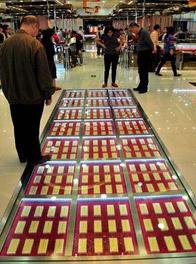 A "gold road" worth 100 million yuan is rolled out at a shopping mall in Guangzhou, which is 5 meters long and made of 252 gold bars. PHOTO BY GAO DIANHUA / FOR CHINA DAILY