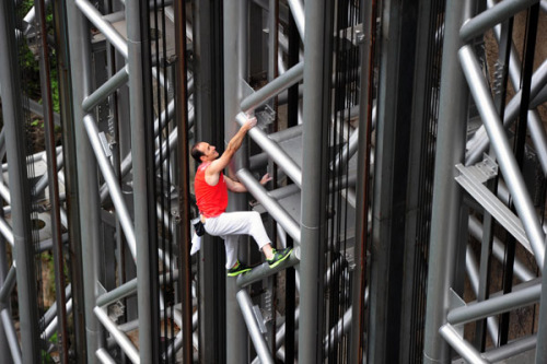 French rock climber Jean-Michel Casanova climbs the 172-meter tall metal elevator frame in Zhangjiajie, a scenic spot in Central China's Hunan province, May 18, 2013. [Photo/Asianewsphoto]