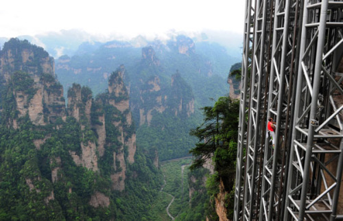 French rock climber Jean-Michel Casanova scales the 172-meter tall metal elevator frame in Zhangjiajie, a scenic spot in Central China's Hunan province, May 18, 2013. [Photo/Asianewsphoto]
