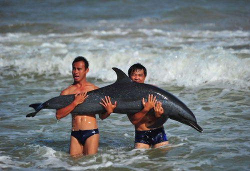 Local residents rescue an injured dolphin in Haitang bay,Sanya,in South China's Hainan province on May 21,2013. The injured dolphin was found stranded in the bay on Tuesday afternoon, then sent to Hainan's Aquatic Wild Animal Rescue Center for treatment around 6:00 pm.[Photo by Sha Xiaofeng/Asianewsphoto]
