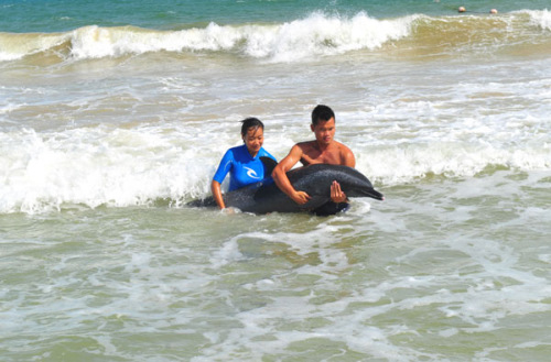 Local residents rescue an injured dolphin in Haitang bay,Sanya,in South China's Hainan province on May 21,2013. The injured dolphin was found stranded in the bay on Tuesday afternoon, then sent to Hainan's Aquatic Wild Animal Rescue Center for treatment around 6:00 pm.[Photo by Sha Xiaofeng/Asianewsphoto]