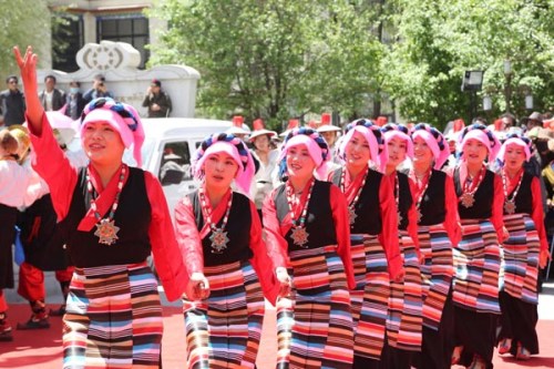 Residents from Nyemo county perform to celebrate the upcoming 62nd anniversary of peaceful liberation of Tibet in Lhasa, Tibet autonomous region, May 22, 2013. On May 23, 1951, representatives of both the central government and the former local government of Tibet signed a 17-Article Agreement in Beijing, marking the region's peaceful liberation. [Photo by Da Chiong/Asianewsphoto]