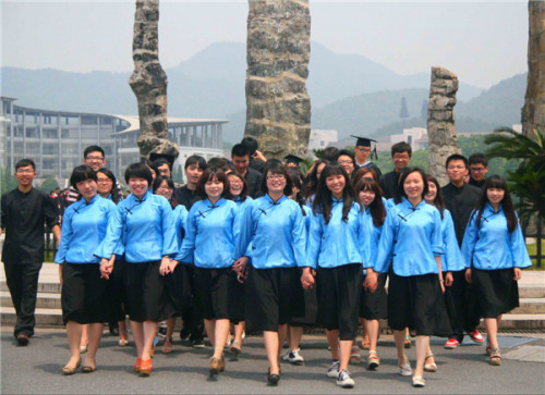 College graduates, wearing period costumes and academic dresses, pose for graduation photos at Zhejiang Agricultural and Forestry University (ZAFU) in Lin'an city, May 22, 2013. China will see a record-high 6.99 million people graduate from college this year. [Photo by Chen Shengwei/Asianewsphoto]